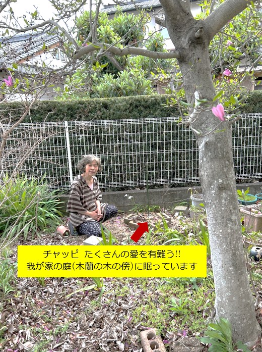 家を新築した20年前に木蘭の木(向かって右側の木)を植えました。この時、木の直径は僅か3cmぐらいでしたが、20年後には30cm程に成長しました。この木の傍にチャッピが眠るなんて。運命だったんですね😢