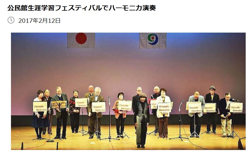 2017年2月12日玉名市民会館大ホールで開催の生涯学習フェスティバルにおいて、岱明公民館講座「クロマティックハーモニカ教室」として出演したときの写真です。